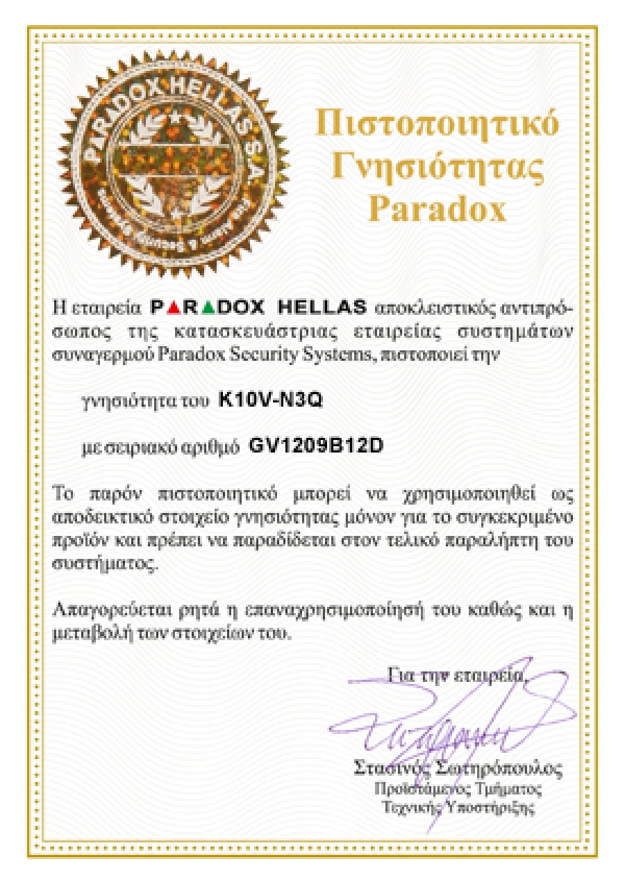 Όλες οι κεντρικές μονάδες συναγερμού Paradox και Paradox EVO καθως και τα πληκτρολόγια Paradox .πρέπει να συνοδεύονται από πιστοποιητικό γνησιότητας